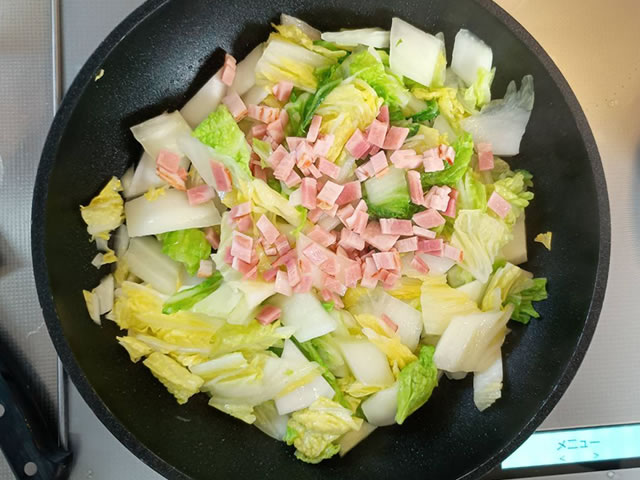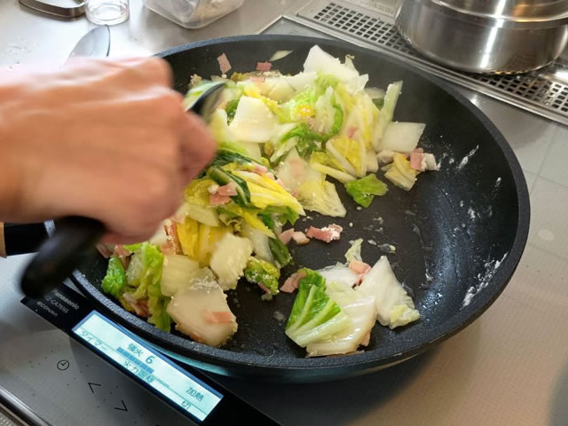 白菜がしなっとなってきたら、ベーコンを入れてヘラなどで軽く混ぜます。