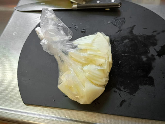 5分~10分ほど置いて水分が出てきたら、つまようじなどでポリ袋に穴をあけて水を抜きます。