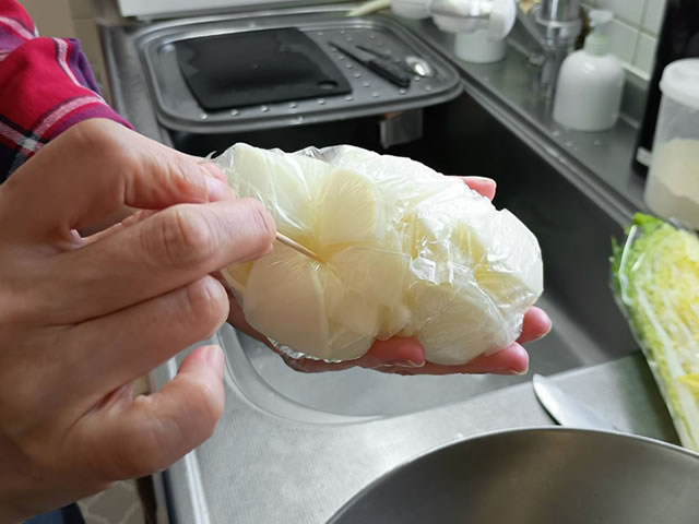 ポリ袋に大根を入れて、塩小さじ1/2を入れたら、全体が馴染むまで揉み、ポリ袋の空気がなくなるように縛って、しばらく置きます。