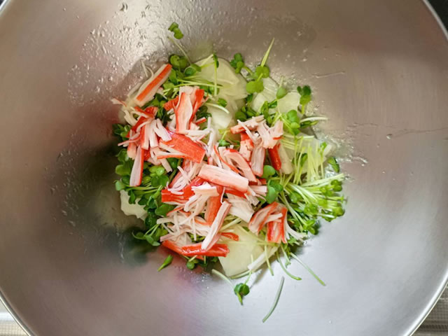 カイワレ、カニカマを食べやすい大きさに揃えてカットして入れます。