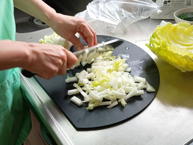 白菜を細かくカットします。茎の部分は少し小さめに切りましょう。