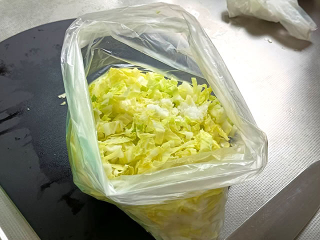ビニール袋に白菜、塩を小さじ1入れて、塩が全体に行き渡るようによく振ったら、空気を抜きビニール袋の口を縛って5分ほど置きます。