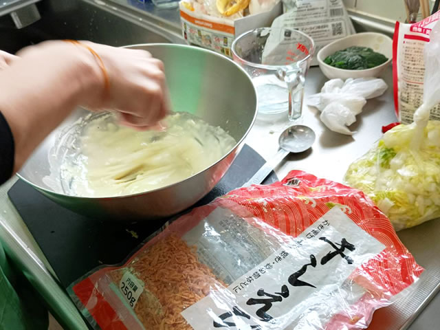 水分をしっかり絞った白菜と干しエビを合わせ、よく混ぜ合わせます。