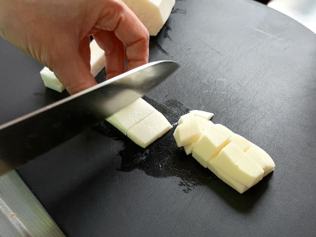 長芋は皮をむいて、1.5センチくらいの角切りにします。