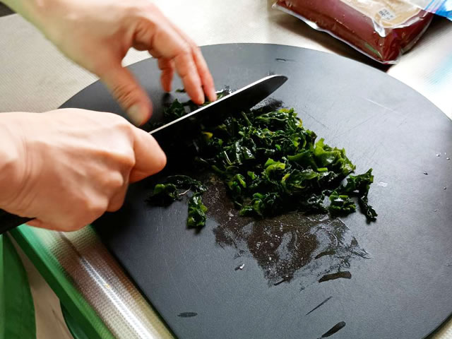 乾燥わかめは水で戻したら細かく刻みます。