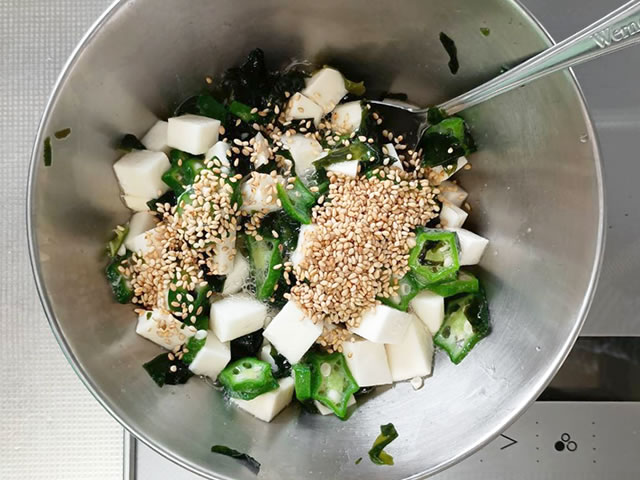 ボウルなどに長芋、オクラ、刻んだわかめ、ゴマを入れます。