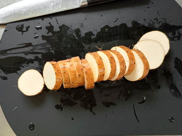 長芋のひげを軽く取って、厚み1センチくらいの輪切りにします。