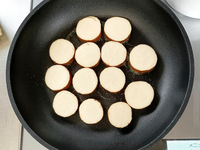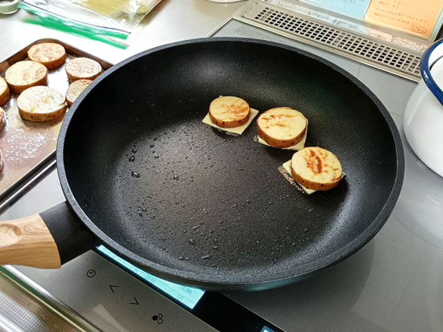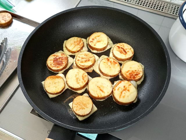 フライパンに残った油分はそのままで、4等分にしたチーズを置き、その上に長芋を置いて焼きます。