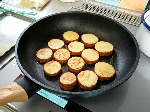 焼き目がついたらひっくり返して、もう片面を3分くらい焼き、途中焼きムラにならないようにフライパンをゆすって長芋の位置を動かし、最後に塩をパラパラと3振りくらいまんべんなく振りかけたら、一旦フライパンから取り出します。