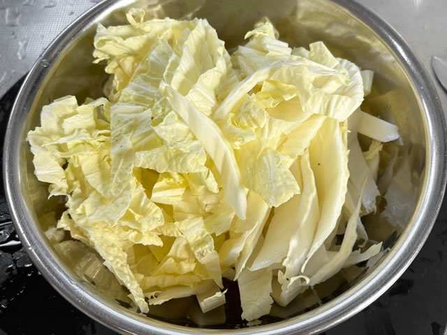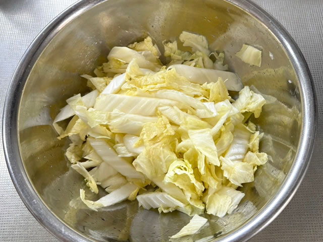 白菜は大きめの千切りにして、塩をふり軽くもんで30分ほど置きます。