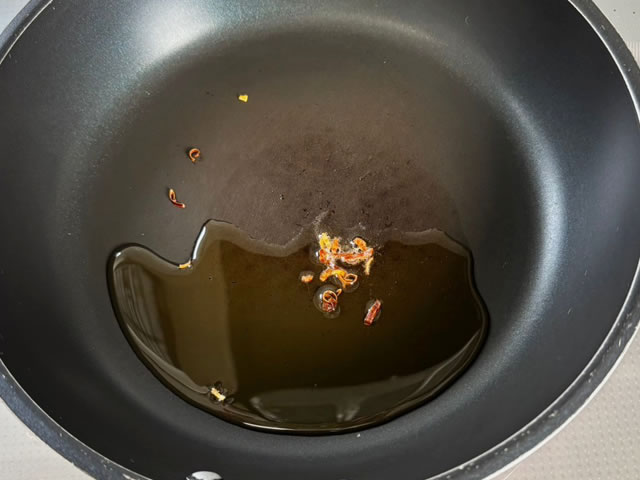 フライパンにごま油を入れ煙が出るくらい熱します。お好みで鷹の爪を入れてくださいね。