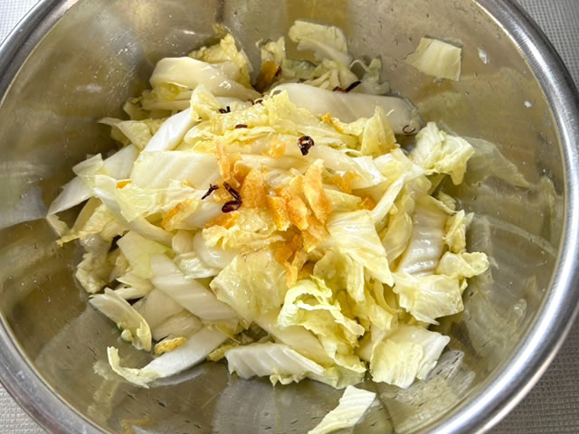 熱した油を白菜ににかけて、柚子(またはレモン)を入れたら混ぜ合わせて出来上がり!