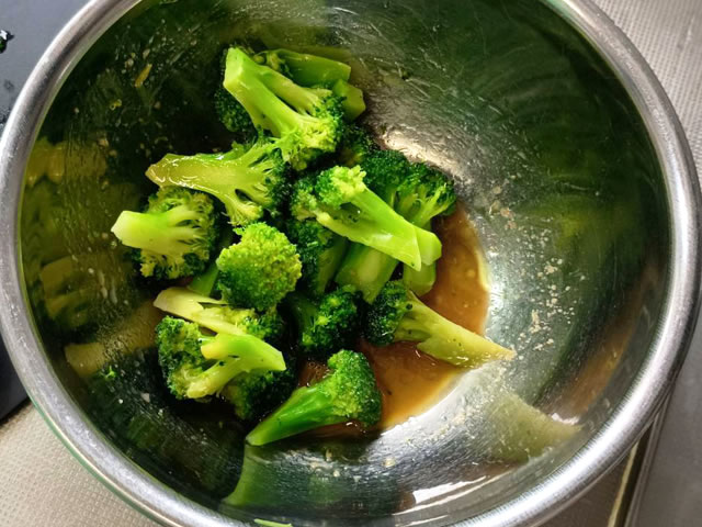 茹でて水気を切ったブロッコリーを入れて、調味料に合わせます。