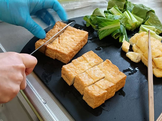 厚揚げを食べやすい大きさに切ります。