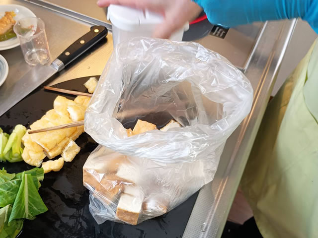 ビニール袋にカットした厚揚げと片栗粉を入れ、厚揚げに片栗粉がまんべんなく付くようによく振ります。