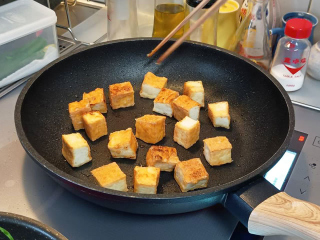 厚揚げはしっかりと焼き色がつくように焼きましょう!