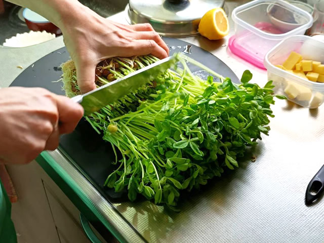 豆苗を袋から出して、横に寝かせて、根本から少し上の茎を切り、茎と葉を使います。