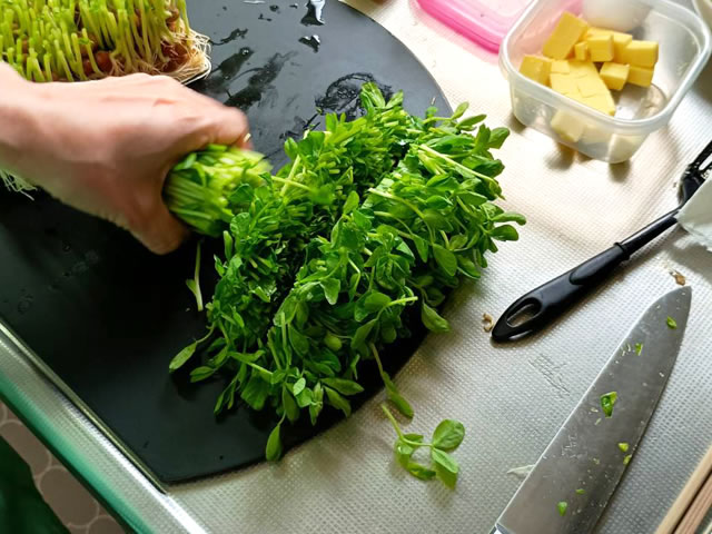 豆苗を3等分くらいに切ります。