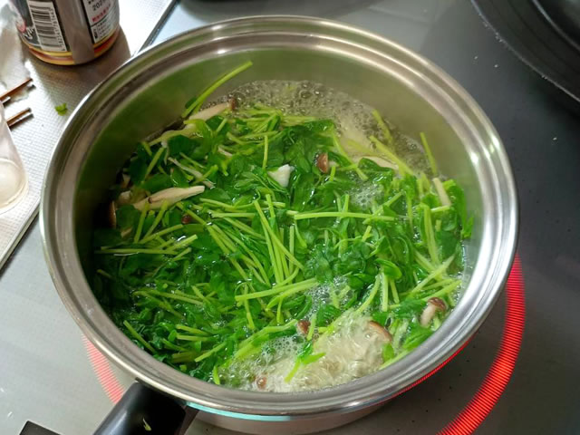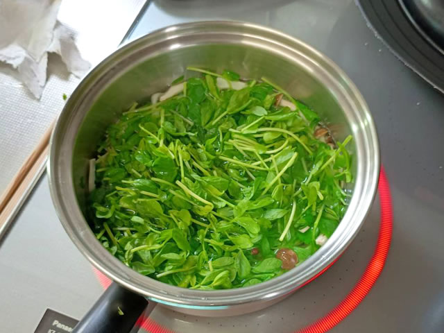 鍋に水500ccとしめじ、豆苗を入れ、火にかけます。