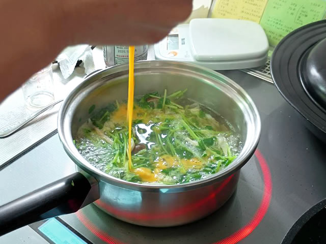 沸騰した状態で、溶き卵を上のほうから回し入れてたら、火をとめて、蓋をします。