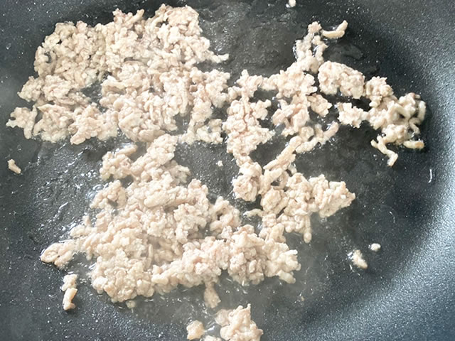 フライパンを温めて油をひき、豚ひき肉に火がとおるまで炒めます。