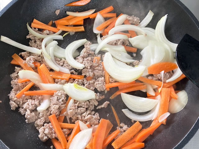 お肉の色が変わって火が通ったら、玉ねぎ、にんじんを順に入れます。