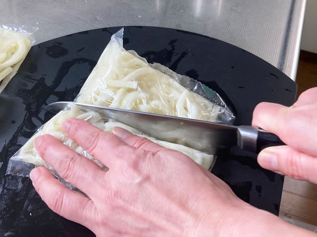 うどんを電子レンジで600w2分加熱したら、袋の上から半分に切ります。