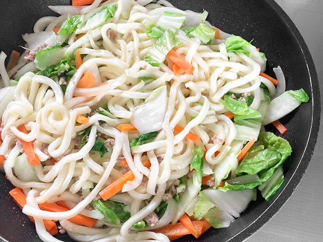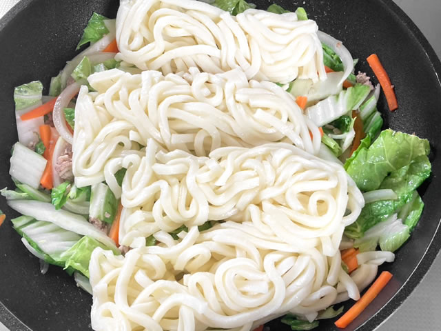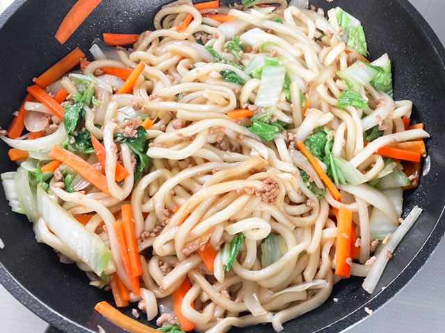 具材とうどんを炒めて、調味料を入れて炒め合わせるだけ!