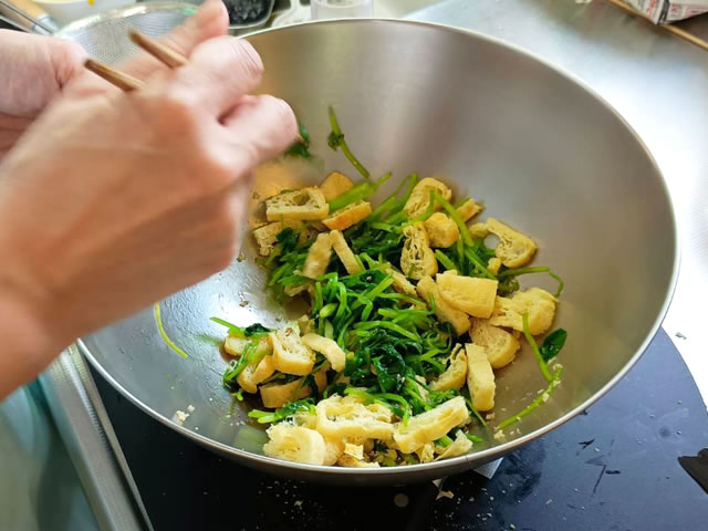 調味料を入れたボウルに水気を絞った三つ葉と油揚げを入れて、和えます。