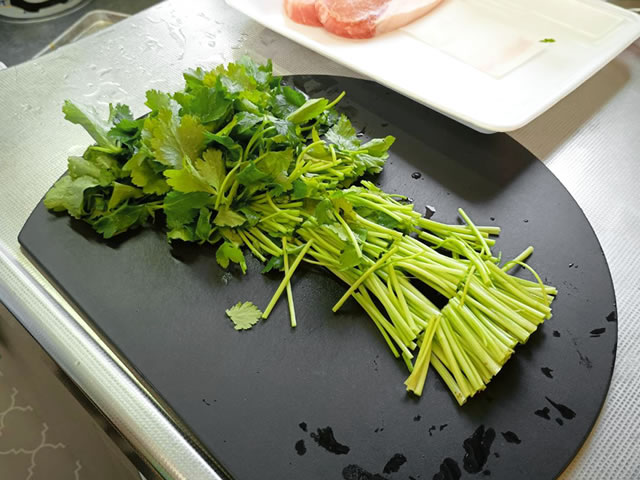 三つ葉は軽く洗い、根本を切り落とし、4~5センチくらいの長さになるように三つ葉をカットします。
