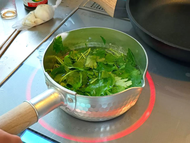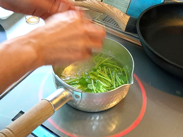 鍋にお湯をわかし、沸騰したお湯に茎のほうから入れます。