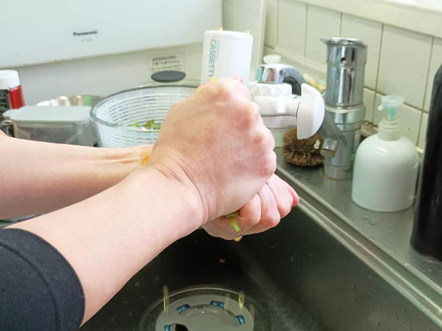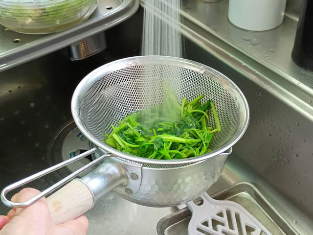30秒ほど茹でたら水で冷やします。氷を入れて冷やすと尚良いです。