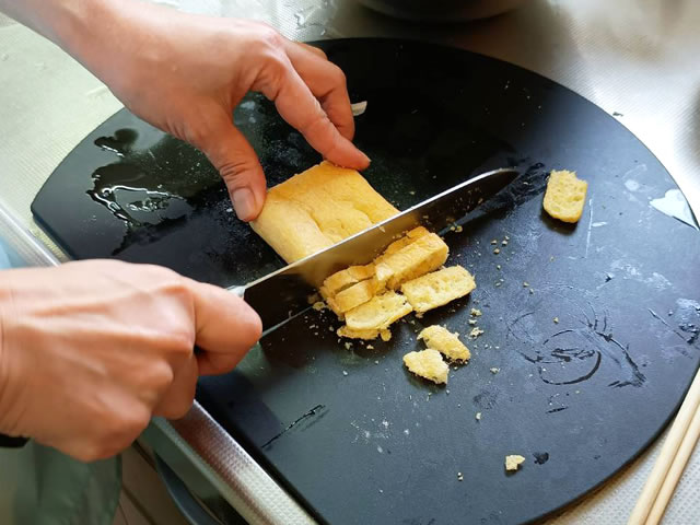 油揚げがこんがりときつね色に焼けたら、食べやすい大きさに切ります。