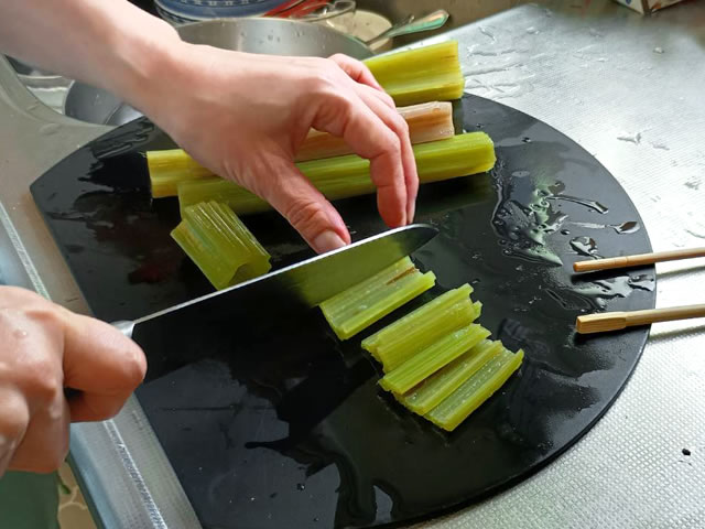 フキを4~5センチくらいの長さに切り、さらに縦に食べやすい大きさに切ります。細いフキならそのままでも良いです。