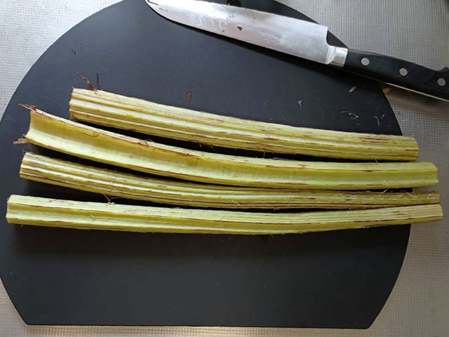 フキの端から包丁を使って少しだけ剥き、あとは反対の端に向かってスーッと引っ張ると簡単に剥けます。