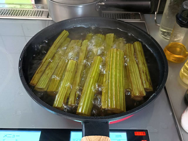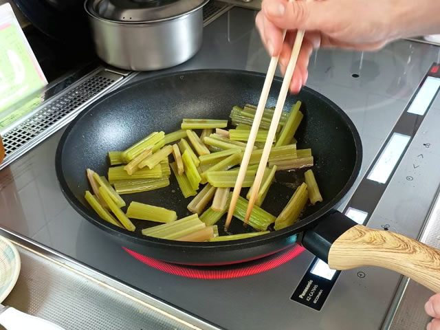 フライパンを温め、ごま油を引き、フキを炒めます。