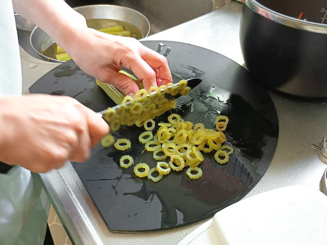 フキの皮と筋を取り除いたら、2~3ミリ幅くらいの輪切りにします。