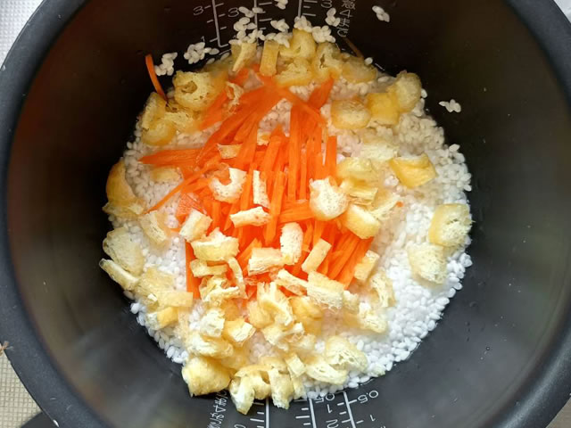 お米を研いだら、千切りにした人参と一口サイズの食べやすい大きさに切った油揚げを入れます。
