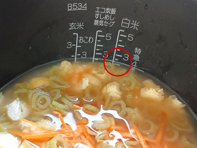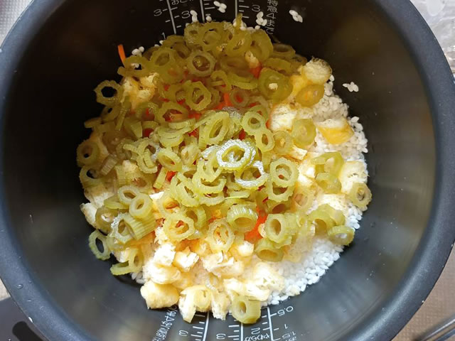 油揚げや人参は水分を吸うので、水加減は少し多めにして炊きましょう。