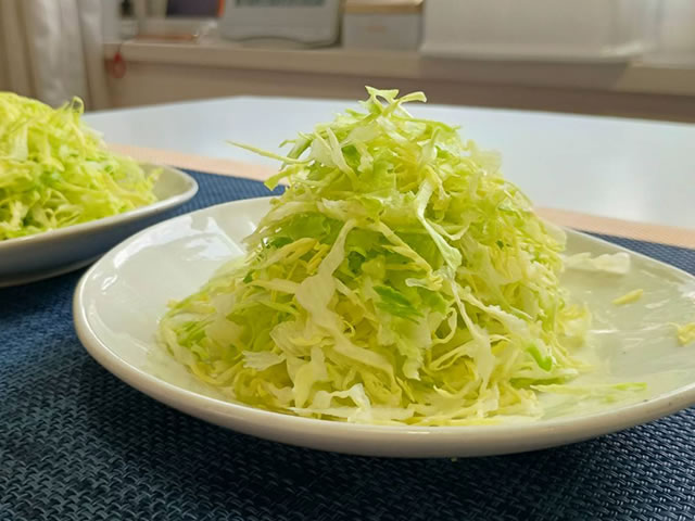 千切りしたキャベツを水に少しさらすとシャキッと食感になります!
