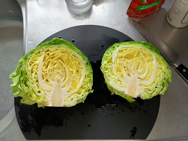 キャベツは半分に切ってから使います☆汚れが気になるときは、さっと表面を洗って使ってくださいね。
