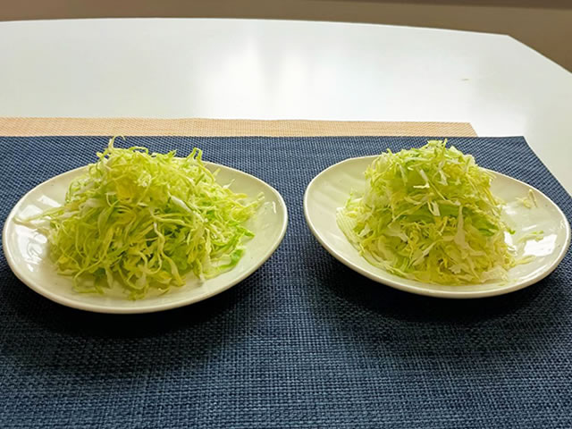 (左写真)シャキッと食感のキャベツ千切り (右写真)ふんわり食感のキャベツの千切り