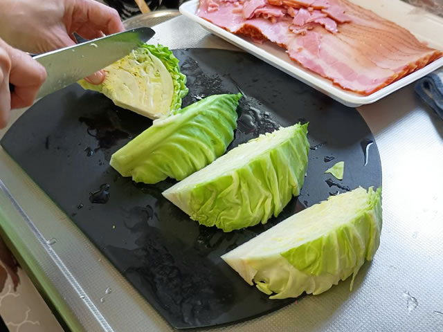 材料を準備する前にオーブンを250度に予熱しておき、キャベツを8等分くらいにざっくりと切ります。