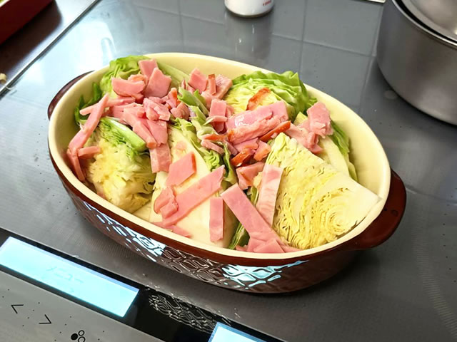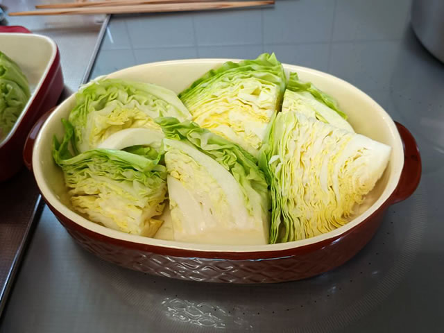 耐熱容器にキャベツを並べます。