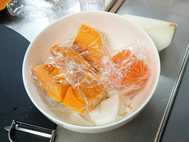 かぼちゃとにんじん、たまねぎを大まかにカットして、かぼちゃとにんじんは乾燥を防ぐためラップに包み、耐熱容器に水を大さじ2を入れて、電子レンジで600W5分加熱します。