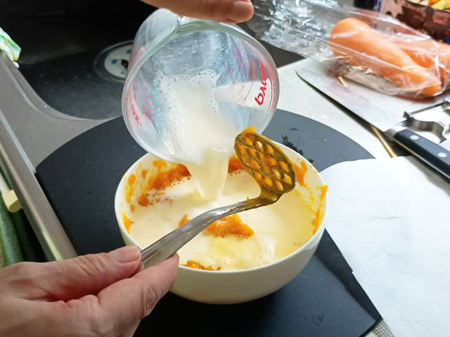ミルクを加えた後、もう一度マッシャーでつぶしながら、全体を混ぜ合わせます。