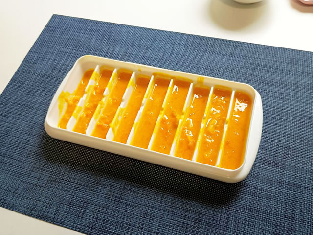 さんさんではダイソーの水筒用の製氷皿を使って冷凍し、凍った後はジップロックなどに移し替えて使っています。