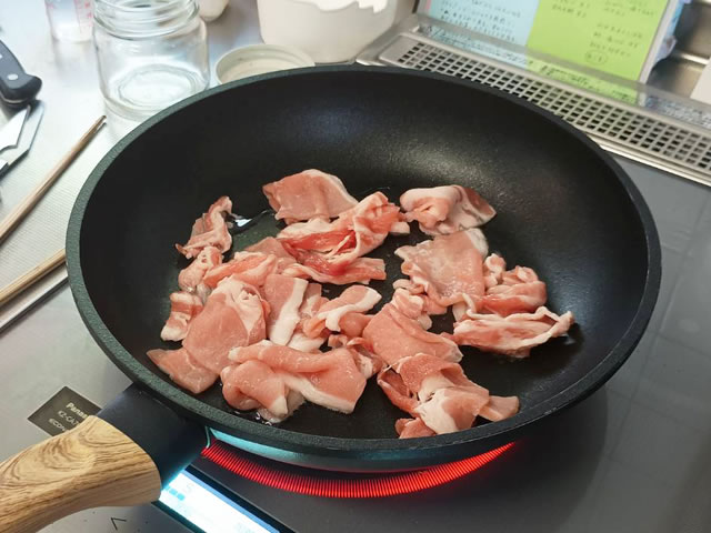 豚肉に塩ひとつまみ、パラパラと振っておき、フライパンをあたため、小さじ1の油をひいたら豚肉を炒めます。