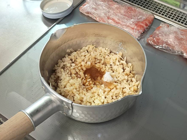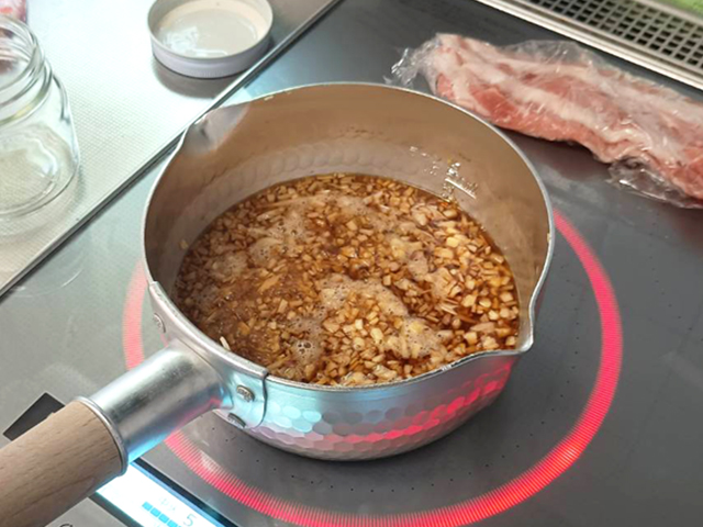 鍋にみじん切りにした生姜と調味料を入れて中火で沸騰するまで煮ます。