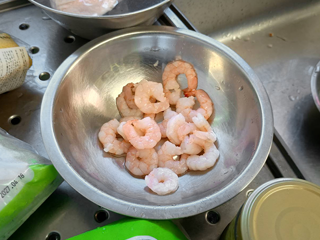 冷凍の茹でエビは軽く洗って、常温で解凍しておきます。夏場なら10分くらいで解凍されます。